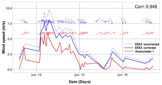 These data should be established at a referential height using the log law and the roughness of urban environments []. The ERA5 grid-point height is 411 m, thus both datasets should be established at the same height, which is the anemometer’s height in this case, since it is the observation.