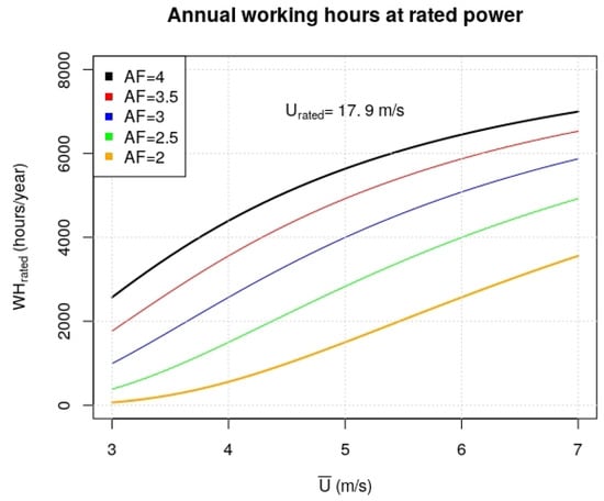 - However, multiplying the scale parameter c by values between 2 and 4 ( is the value obtained in the laboratory using only one inferior vane and 4 the maximum expected value according to the mentioned literature) and keeping the typical value of , the total augmentation factor from the PAGVs and the edge effect increases the AEP and working hours. Figure 13 shows the annual working hours () at rated power in function of the average wind speed of the site for different factors: .At low annual average wind speed of 3 m/s, the maximum can produce 2000 h at rated power. At m/s, between 2.5 and 3 is necessary to ensure the 2000 h. At m/s, the minimum obtained with only the inferior vane (Figure 5) is almost sufficient. At high s, an or 4 implies 75% of the time at rated power.