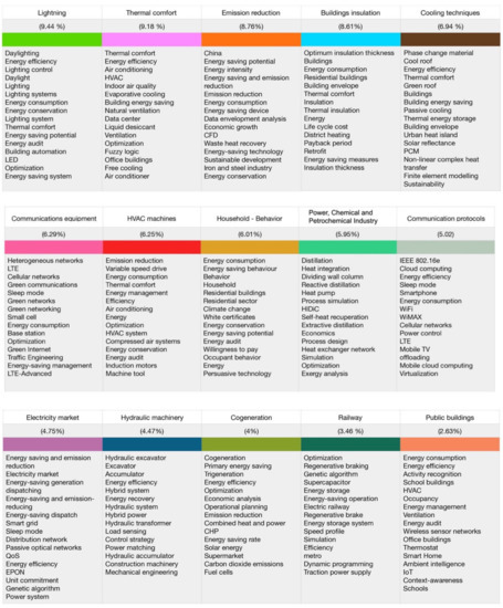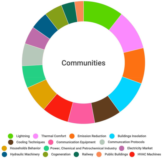 Fifteen communities are detected within the large network of publications related to the term energy saving. In Figure 5, it can be seen that the area with the highest number of publications is lightning and thermal comfort, followed by emission reduction and building insulation. The high energy consumption that occurs in homes and businesses, together with the growing concern about the impact that energy consumption has on the environment, could show how important the search for facilities and systems that enable energy savings in these field is becoming. On the contrary, the railway and public buildings communities are in the last place of the ranking, with a percentage lower than 4%.