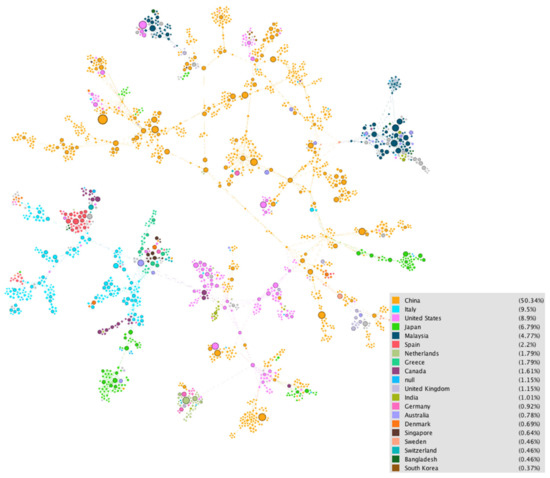 Regarding the authors and their relationship among them, it has been seen that in total there are 43,860 researchers. In Figure 6, the authors have been represented by colours according to the country of origin. This figure shows that the researchers that contribute most to the development of scientific production, come from academic and scientific institutions from China, which has the highest number of authors with more than half of the total number, followed by Italy (9.5%), the USA (8.9%), and Japan with 6.8%. Afterwards, with less percentage are Malaysia (4.77%) and Spain (2.2%), and finally a block of countries with a percentage below 2%. Null means that the Scopus register does not contain information on the country of the author.