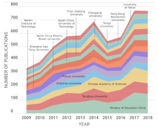 In Figure 8 and Table 1 we can see the evolution of the publications developed by the most productive institutions worldwide in the last 10 years (2009–2018). On the bottom of the figure, the production of Ministry of Education of China can be seen, which is the most important institution registered. It does not surprise that, as a fact, it would englobe a lot of researching in the most populated country in the world. This institution represents the 1.64% of the total research (718 publications). Above it, the Tsinghua University represents the 1.59% (699 publications). This institution is one of the biggest universities in Asia with more than 40,000 students, 32,000 of which belong to masters or doctorate degree. After them, we have more institutions and as we can guess, all of them belong to China. It was a highlight surprise to notice all the research developed in this country and the high difference between China and other countries, at least in this search.