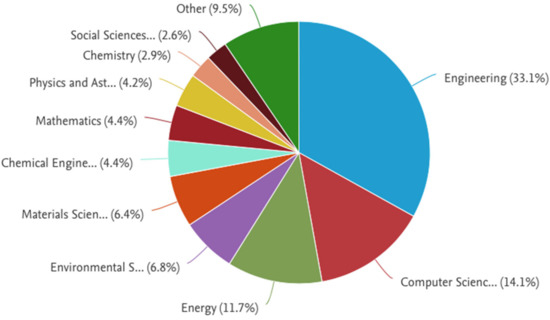 Regarding the language of publication, as expected, is dominated by English in more than 87.1%. However, when compared to other scientific fields, it is usual to be above 90%, which suggests that journals in particular countries address this issue in a significant way. As example the Dianli Xitong Zidonghua/Automation of Electric Power Systems, or Zhongguo Dianji Gongcheng Xuebao/Proceedings of the Chinese Society of Electrical Engineering. Such is the case of China, which contributes almost 10% of all publications in its own language. To a lower extent, German (e.g., the journal eb—Elektrische Bahnen) and Japanese (e.g., the journal IEEJ Transactions on Power and Energy from The Institute of Electrical Engineers of Japan), both around 2%, stand out. In any case, it is clear that China, as one of the world largest consumers of energy, has a great concern for energy saving [33], as was to be expected. This is also evident if it is observed that the main institutions that publish on this subject are also from China, Table 2. If the analysis focuses on the scientific fields where these works are assigned, Figure 9, it is remarkable that the first is not energy, but that the first place is occupied by engineering with 33.1%, showing that developments in this field are the largest part of the contributions, especially those related to energy conservation [34]. On the other hand, it is surprising that Computer Science plays such an important role in this field; this is justified by optimisation-related works [35]. Finally, it should be noted that one of the largest group is “others” with 9.2%. This should indicate the great diversity of scientific fields from which this subject is approached, being important the contribution to the energy saving that is studied from the greater number of points of view [36], which is what will allow to contribute to the global energy saving including geographical areas with serious energy shortages [37].