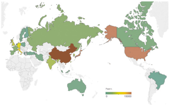 Figure 10 shows the distribution of publications by country. On the map, red is associated with a high number of publications. Green indicates that there are less publications or grey means that there are no publications or a very limited number of them. It is easily observed how China is the country with more publications (18,309), followed by United States (3716), Japan, and Italy. Also highlight Germany, United Kingdom or Taiwan. This information leads us to the idea of how important the energy saving in the industrialised countries has become, as the richer states have also become involved in this issue by using harsh policies to achieve the proposed objectives. Figure 11 shows the 15 countries that have contributed the most in the last decade.