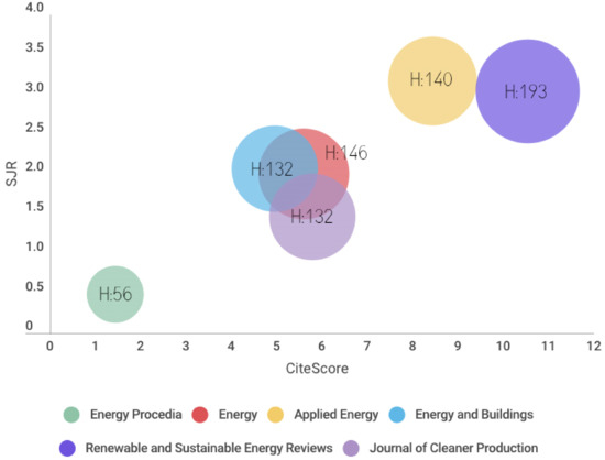 In Figure 13 and Table 4, the ranking of the six most important journals are shown. We have analysed not only the Scimago Journal Rank by Elsevier, but also the CiteScore. The metric of the latter calculates the citations of all papers submitted in the past few years preceding a title. It also includes Source Normalized Impact per Paper, SCImago Journal Rank, quotation and documents counting, and quotation rates. In the figure we have included also the H-Index as it has become very popular in the last decade and the reader can figure it out by the size of the circle according to each of the journals. We can see how “Renew. Sust. Energ. Rev.” is the journal with higher not only SJR (3.04), but also CiteScore (10.54).