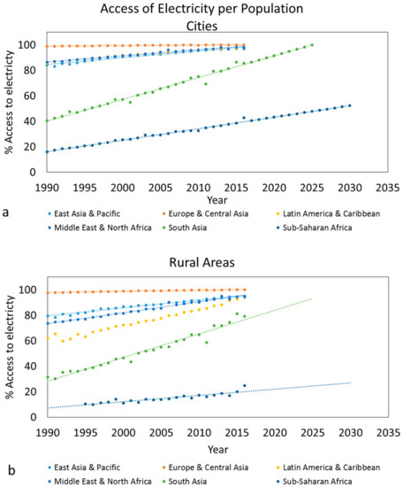 Percentage of population with electricity access during 1990 to 2016 with a projection to 2030 (a) cities and (b) rural areas. Data provided by the World Bank [11].