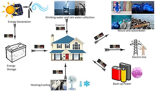 As mentioned above, nano-grids or islanded power grids are becoming an important asset that may increase electricity access in rural areas. Such an off-grid system uses various types of renewable electricity sources. They are connected with batteries and a backup power system to avoid power outage. Figure 5 illustrates a common configuration for an islanded off-grid house. It takes into account the need for electricity for heating, electrical appliances, water production, and waste water treatment. This nanogrid or standalone house has the following main components: