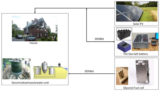 In this section, we present a case study for an off-grid house. The goal of this study was to show that it is technically feasible to develop an off-grid house. The economic aspects of off-grid houses are beyond the scope of this paper. Figure 6 shows the setup of an islanded off-grid house using new sustainable technologies developed in the Netherlands. In general, the setup uses various technologies to generate the electricity needed for a house, and it is designed to also supply electricity to a decentralized wastewater treatment plant (DWWTP). To achieve this, solar PV is used coupled with a battery.