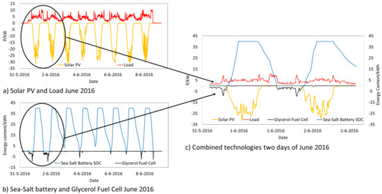 Figure 7a shows the data of electricity load and solar PV production during the first week of June 2016. Figure 7b shows the electricity content of the simulated sea-salt battery and the production of the backup glycerol fuel cell during the first week of June 2016, and Figure 7c shows the zoom in of the compiled data of the house load, solar PV, the sea-salt battery and the glycerol fuel cell in the first two days of June 2016. It was observed in detail that the overall profile of solar PV was constant throughout the days, and a maximum electricity production of 30 kW was observed. On the other hand, the house load showed a maximum value of 10 kW during the first week of June 2016 (see Figure 7a). In Figure 7b, it was observed that the sea-salt battery stored the surplus of electricity that was provided from the solar PV during the day. Furthermore, the sea-salt battery is discharged typically during the evening and night (the modelled battery has a size of 45 kWh). Moreover, during the night, it was observed that the sea-salt battery did not always cover the required house load. In such situations, the glycerol fuel cell of 11 kW (black line) covered this demand and was active until the solar PV covered the demand of the house on the next day. In Figure 7c, a more clear detail view of the interaction of the solar PV, the sea-salt battery, and the glycerol fuel cell is given for the first two days of June 2016.