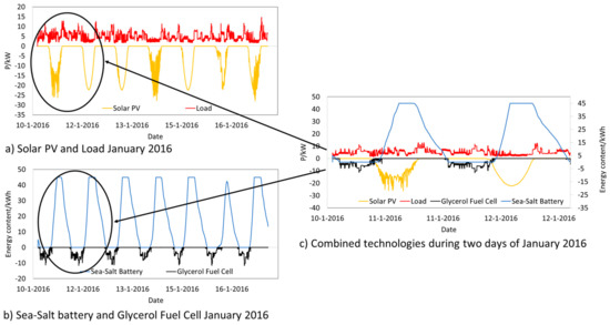 Figure 8a shows the data of electricity load and solar PV production during a winter week in January 2016, and Figure 8b shows the corresponding electricity content of the simulated sea-salt battery with the backup glycerol fuel cell during the same week of January 2016. Furthermore, Figure 8c shows the zoom in of the compiled data of the house load, solar PV, sea-salt battery, and the glycerol fuel cell during two days of the same week. In detail, it was observed that overall, the profile of solar PV stayed constant over this week and the maximum electricity production was of 30 kW.