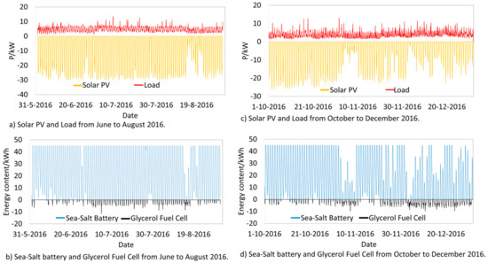 DEMkit results of an off-grid house in the Netherlands with hourly data with Solar PV, sea-salt battery and a glycerol fuel cell during the months of June to December 2016 showing (a) Solar PV and Load from June to August 2016, (b) Sea-salt battery SoC and glycerol fuel cell power from June to August 2016, (c) Solar PV and Load from October to December 2016, (d) Sea-salt battery SoC and glycerol fuel cell power from October to December 2016.