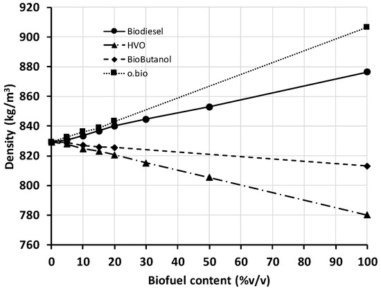 Compared to the density of diesel fuel (biofuel content = 0%), blends with biodiesel (FAMEs) or o.bio® (FAMEs and FAGEs, mainly) increase density, while blends with HVO or butanol have the opposite effect. The density of biobutanol is closer to that of diesel than that of ethanol (ethanol was not tested here, but it is the most common alcohol used for diesel blending despite its miscibility and hygroscopic problems), which is one of the advantages of biobutanol blending over ethanol. Considering the importance of limiting the variations of density, it would be possible to design a diesel blend with a selected composition of two of the biofuels here tested (biodiesel and HVO, for example, since the production processes of both biofuels have been suggested to be combined in a single plant [22]) obtaining a ternary blend which keeps the density at the same value than diesel’s.