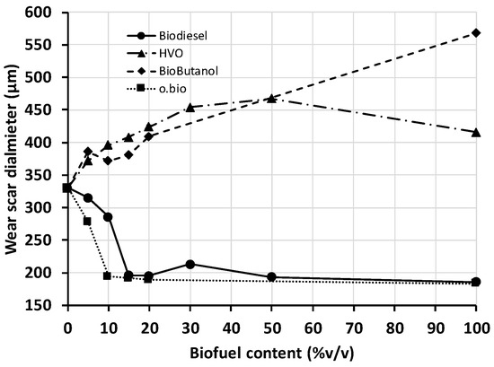 Figure 3 presents the lubricity of the fuels and blends of this work. Neat diesel and HVO are commercial fuels, additivated with lubricity enhancers by the fuel manufacturers to fulfill the limit (lower than 460 μm) set in EN 590 (for automotive diesel fuels) and EN 15940 (for paraffinic fuels). The highest wear scar diameter (i.e., poorest lubricity) was found for biobutanol, though this alcohol is better lubricant than ethanol [15]. The biobutanol tested has no lubricant additive as it was used as received from the chemical supplier. Both ester-based fuels, biodiesel, and o.bio®, exhibited the best lubricity. The ester functionality present in FAME (biodiesel) molecules can be adsorbed on metal surfaces while the rest of the chain (long aliphatic chain) creates a film that prevents wear. The extremely good lubricant properties of biodiesel have been proved previously [28,29], but the results here presented confirm now the same result for FAGE/FAME blends.