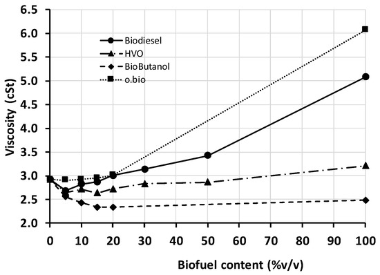 In the present work, each sample was measured three times, and the deviation between replications never exceeded 0.02 cSt. The viscosity values are illustrated in Figure 4. The neat biofuels ranked as follows: biobutanol showed the lowest value; followed by HVO, which viscosity was close to that of diesel fuel; and biodiesel and o.bio® finally, the latter with the highest value. Glycerol esters (FAGE) are characterized by higher viscosities than methyl esters (FAME); therefore, if FAGE is blended in FAME as in the present o.bio® fuel and the final FAGE/FAME blend is desired to meet the current biodiesel standard, a low viscosity FAME is preferred to enlarge the feasible FAGE content window.