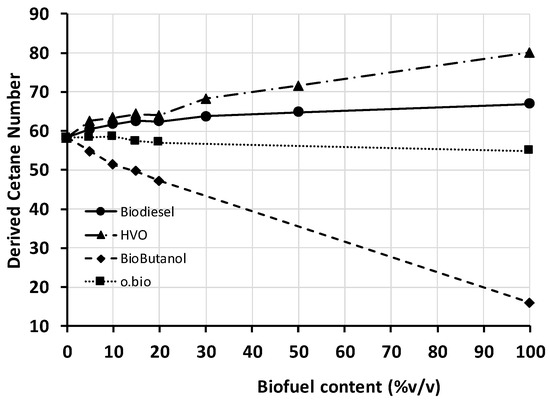 Each sample was measured once, but the given value is the average of 15 fuel injection events in the measuring instrument. Diesel fuel was replicated twice, and the deviation was less than 0.5 units. The results, presented in Figure 6, show that HVO fuel has a very high cetane number as usual in paraffinic fuels, while neat biobutanol has an extremely low value (pure alcohols are more appropriate for spark ignition than for compression ignition engines). For diesel automotive applications, biobutanol/diesel blends should be limited at 10% biobutanol content to maintain a cetane number higher than 51. Sometimes the addition of biodiesel to alcohol-diesel blends has been explored to compensate for the low cetane number of alcohols [34].