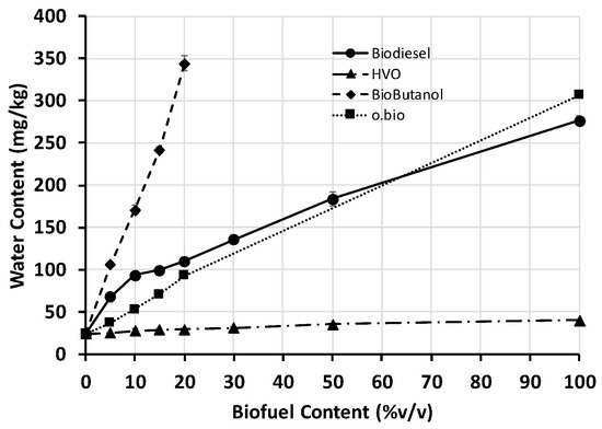 Figure 7 shows the water content of the samples tested in this work. All the fuels and blends were measured three times and deviation never exceed 20 mg/kg between replications. Neat diesel and HVO showed water contents below 50 mg/kg. Both fuels meet their respective quality standards, and therefore all HVO/diesel blends. Biodiesel presented a higher water content than HVO and diesel, but still below the limit of the standard EN 14214 (500 mg/kg). O.Bio® fuel presented similar values of water content than biodiesel, which proves the higher hygroscopicity of esters compared to hydrocarbons.