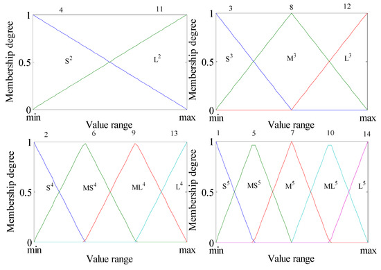 The form of fuzzy partition depends on the complexity of historical state data. In this work, four different fuzzy partitions are simultaneously used by symmetric triangular fuzzy sets, since it is hard to obtain an appropriate fuzzy partition for different attributes, as shown in Figure 1. To make the subsequent local mutation meaningful, the fuzzy sets are renumbered according to their vertex positions and slope of hypotenuses.
