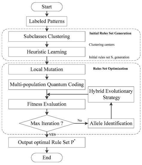 The proposed MPQEA-FRBCS is utilized for rules mining and fault identification after feature selection. The FCM algorithm and heuristic learning are combined to generate the representative initial state rules set, and then the multi-population quantum evolutionary algorithm is adopted as a framework for the optimization of the state rules set.