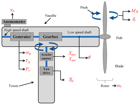 The FAST benchmark [26] is a SimuLink-based model with sealed FAST code, in which 15 sensors are used for the measurement of the monitoring variables, and white noise is added to all sensors. The detailed descriptions of each sensor and noise level are shown in Table 2, and the sensors’ locations are shown in Figure 4.