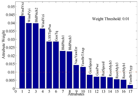 In the experiment of fault identification and probability analysis for offshore WTs, ReliefF was utilized for feature selection of the state variables. The feature weight of ReliefF is proportional to the ability to distinguish the samples. The iteration m is 100, the number of nearest neighbor samples is 10, and the threshold is 0.01. The sorting of feature weights is shown in Figure 6. The 10 features with the maximum weights according to the set threshold were selected for subsequent experiments: wind speed (x-axis, y-axis, z-axis), pitch angle (#1 blade, #2 blade, #3 blade), generator torque, generator rotor azimuth, tower top acceleration in x direction, and yaw error.
