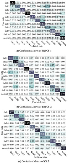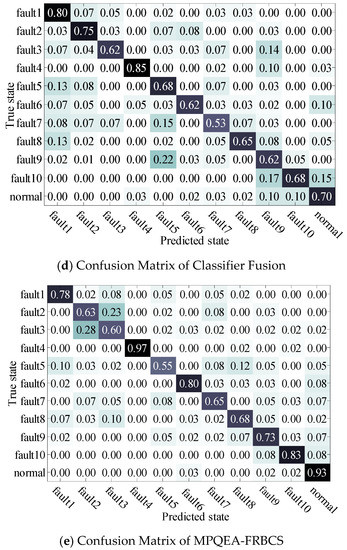 To verify the superiority of the proposed MPQEA-FRBCS in fault identification accuracy, its identification result is compared with the similar FRBCSs proposed in [32] and [33], the classifier fusion scheme proposed in [17] and the C4.5 classifier. The identification accuracy and parameter settings of each algorithm are shown in Table 8, the confusion matrixes of considered methods are shown in Figure 7.