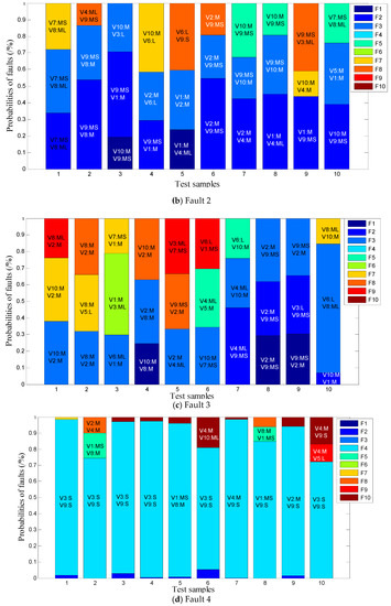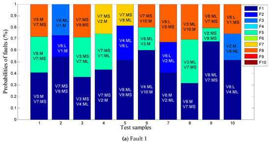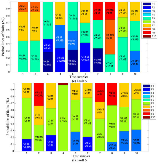In Figure 8, each test result outputs the three most likely faults in probabilistic form, and provides interpretable language labels of critical state variable. It can be seen that the real fault can be found in the range of the first three probability sorts in most test results. In this way, the reparation through probability sorting can shorten the time of fault troubleshooting, even if the fault identification result is unwarrantable. In addition, maintenance personnel can make more reasonable maintenance decisions by combining the probability sorting of faults, interpretable language labels of critical state variables, and expert knowledge.
