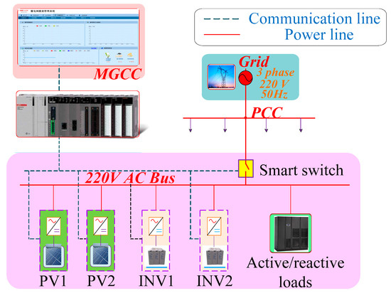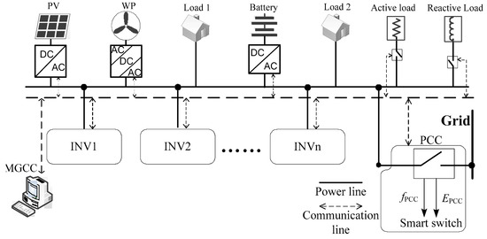 The typical microgrid topology is shown in Figure 1. The system commonly comprises DGs such as photovoltaic and wind power generations, as well as large-capacity energy storage devices that maintain the stability of the microgrid voltage and frequency. These devices are connected to the AC bus via the inverters. Some active and reactive loads are also included in the microgrid system. Equipment with communication functions such as specific DGs and smart switches can be connected to the microgrid central controller (MGCC) which can also send control instructions to DGs and smart switches in turn. When the smart switch at PCC is disconnected, the whole microgrid system operates in islanded mode. At this time, the microgrid can adopt a peer-to-peer control structure, and then use the control strategy such as droop control [19] and virtual synchronous machine control [20] to form the voltage and frequency of the microgrid.