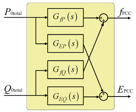 where mi and ni refer to the active and reactive power droop coefficients of ith inverter, Pi and Qi refer to the active and reactive power references of ith inverter, and fPCC and EPCC are frequency and voltage amplitudes of PCC. GfP(s) and GEP(s) are transfer functions of the active power reference with respect to the frequency and the voltage amplitude of PCC respectively, GfQ(s) and GEQ(s) are the transfer functions of the reactive power reference with respect to the frequency and the voltage amplitude of PCC respectively. Among them, GEP(s) and GfQ(s) are added to the model specifically in order to analyze the cross-coupling effect.