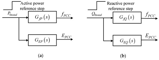 Since the step experiment process is easy to realize and has good identification performance, the step response experiment is adopted to identify the transfer function of the model. In order to simplify the identification process of the transfer functions mentioned above, this work divides modeled transfer functions into two groups. As shown in Figure 5, one group carries out the step experiment by performing a step on the active power reference value, the other group carries out the step experiment by performing a step on the reactive power reference value.
