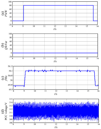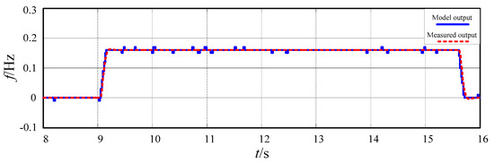 Meanwhile, the same experimental processes as shown in Table 1 are carried out on a corresponding simulation model under the MATLAB/Simulink environment (2014a, The MathWorks, Inc, Natick, MA, USA), which is constructed according to the black-box equivalent model shown in Figure 4. Initial values of P and can be figured out according to the transfer function parameters obtained in Section 3.2 and Section 4.1. The frequency and voltage output of the simulation model can be obtained by using the recursive damped least squares method for online identification.