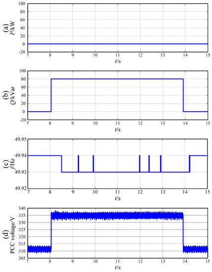 To carry out the identification experiments of GfQ(s) and GEQ(s), parallel inverters and the three-phase reactive load are integrated into the microgrid. After the system reaches a steady state, the active and reactive power references are set to 0 by MGCC at first. Then the reactive power reference is changed to 80 kVar at 9 s, and set to 0 again after 5.6 s. During this experiment, the active power reference remains at 0. Figure 10 shows the identification data Q0total, EPCC2, and fPCC2 sampled by the waveform recorder at PCC.