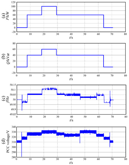 According to the power references step experiments, the voltage frequency response model is obtained under the certain microgrid structure. Furthermore, in order to verify the adaptability of the recursive damped least squares method applied in the model identification, that is, the online identification effect during the period of microgrid structure changing, several adjustments have been made: active power droop coefficients of two inverters are changed to 4 × 10−6 and 8 × 10−6 respectively; reactive power droop coefficients are changed to 2 × 10−4 and 4 × 10−4 respectively; the PV inverter which is supplied by Chroma solar PV array simulators is added to the microgrid structure, and the maximum output power of the PV inverter is set to 4 kW. During the power references step experiment, the number of inverters connected to the microgrid are changed, the active and reactive loads are set to different parameters, as listed in Table 1.
