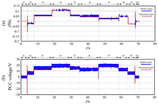 Identification model and measured output curves (a) PCC frequency; (b) PCC voltage amplitude.