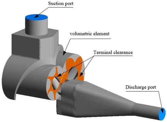 The working process of the twin-screw compressor is very complicated. In order to facilitate the simulation and reflect the working process of the compressor, this study divided the fluid domain model into three parts: the suction port, the volumetric element, and the discharge port. The three parts needed to be connected in the calculation process, so that the data information could be exchanged. Figure 1 shows the control volume fluid domain of the compressor.