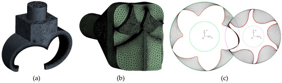 In TwinMesh, various parameters can be set to generate the grid. After grid independence verification, the number of circumferential nodes of the rotor profile was set to 720, and the maximum mesh size was set to 1 mm. It was necessary to draw a set of grids per degree, so a total of 72 sets of grids needed to be generated. When simulating, ANSYS-CFX can automatically select the corresponding grid for calculation. In order to make up for the oil’s sealing, which will reduce the leakage of refrigerant, the leakage clearance of the compressor was appropriately reduced when generating the cells in TwinMesh, as shown in Figure 2c. The minimum angle of the grid needed to be greater than 18° to meet the calculation requirements. The closer the grid angle is to 90°, the better the grid quality. Finally, the number of hexahedral meshes generated in the volumetric element fluid domain was 5,279,175, and the quality met the requirements.
