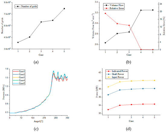Figure 4a shows the cell numbers in different cases, Figure 4b shows the volume flow in different cases, Figure 4c shows the P-θ diagram in different cases, and Figure 4d shows the power in different cases. It can be seen from the figure that the number of circumferential nodes of the rotor profile and the number of axial nodes had a great influence on the compressor volume flow, and the number of radial nodes had little influence on the compressor volume flow. The number of cells had the greatest influence on the volume flow, and had little effect on the pressure and the indicated power, but the volume flow is one of the most important performance parameters of the compressor. Therefore, the volume flow should be used as the basis for the simulation results. Considering the cost of computing resources, this paper used the mesh of Case4 for the simulation calculations.