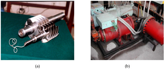 Experimental device. (a) Pressure sensor in the female rotor. (b) Experimental test compressor.