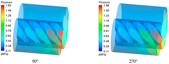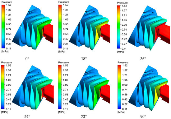 As the pressure on the rotor surface represents the distribution of pressure in the working volume of the compressor, the pressure changes inside the compressor at different angles are shown in Figure 6. Since a 5-6 rotor profile was used in this simulation, the pressure changed periodically every 72°. Therefore, the pressure distribution at the rotation angles of 0° and 72° was identical, and the pressure distribution at 18° and 90° was also the same. The pressure gradually increased along the spiral surface of the rotor from the suction port to the discharge port, and the pressure of the discharge port reached the maximum.