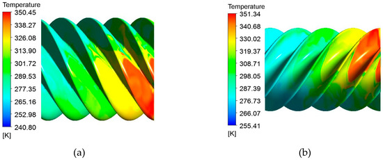 The temperature distribution of the surface of the male and female rotors: (a) male rotor; (b) female rotor.
