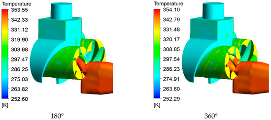 Inside the compressor, the temperature rise is mainly caused by the following parts: the heat generated by the friction between gas and casing, the heat generated by the compressed gas, and the flow loss and impact loss. Figure 9 shows the temperature distribution of the surface of the male and female rotors. Figure 10 shows the temperature distribution inside the compressor at different angles. It can be seen that the temperature gradually rose along the axial direction of the rotor, and the temperature near the discharge port was the highest. Additionally, the temperature at the discharge port was significantly larger than the suction port, which was in line with the actual situation. This part of the study can provide a reference for the location design of the oil injection port.
