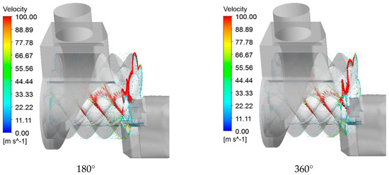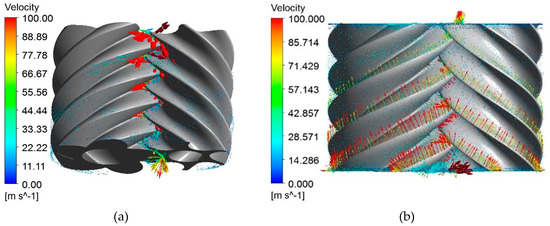 As shown in Figure 11, due to the intermeshing clearance between the male and female rotors, the gas flows back through the intermeshing clearance during the high-speed rotation of the rotor, causing the leakage from the high-pressure chamber to the low-pressure chamber. The velocity in the leakage increases as the pressure differential across the adjacent volumetric elements of the rotor becomes higher, and the velocity of the fluid at the intermeshing clearance is much greater than the velocity of the fluid in the volumetric element. For the same reason, the radial clearance of the compressor also has this leakage problem. Figure 12 shows the leakage velocity vector of the compressor at different angles. It can be seen that the refrigerant flow rate between the different volumetric elements hardly changed and the leakage in the terminal clearance was obvious. The maximum leakage velocity exceeded 200 m/s. The leakage of gas in the compressor was mainly caused by the difference in pressure between the different slots, and the distribution law of the leakage velocity was positively correlated with the pressure difference. Gas leakage changes the flow state of the internal airflow of the compressor and greatly reduces the efficiency of the compressor, so it is especially necessary to properly control the leakage of the twin-screw compressor.