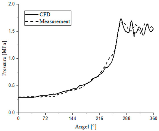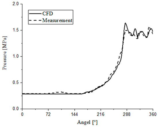 Figure 13 and Figure 14 show the P-θ diagram of the screw refrigeration compressor under partial load (75%) and full load conditions. It can be seen that the pressure curve obtained by the CFD calculation agreed well with the experimentally measured pressure curve. In the discharge process, the CFD calculation model failed to accurately reflect the actual process, which may have been caused by the large pressure pulsation in the discharge process.