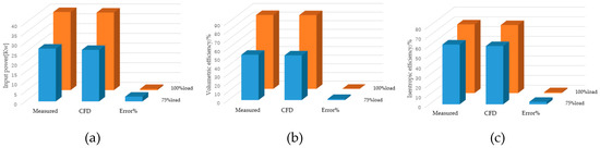 As shown in Figure 15, under full load conditions, the error between the results obtained by the CFD calculation and the experimental results was less than 1%. Under partial load conditions, the error of input power and isentropic efficiency calculated by CFD was large, but the error value was less than 3%. The results of both conditions were within the tolerances.