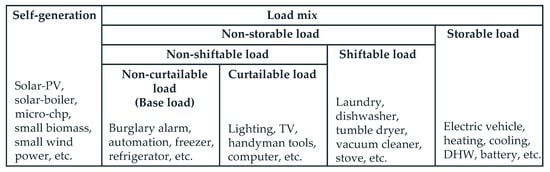 To provide a complete energy characterization of domestic users, the electrical and thermal users’ analysis has been carried out, assessing their peculiarities in terms of management flexibility, specific energy consumptions, power commitments and time. Thus, for that purpose, a preliminary classification has been drawn up (see Figure 1) according to [], distinguishing four load typologies and the self-generation, which are defined as follows: