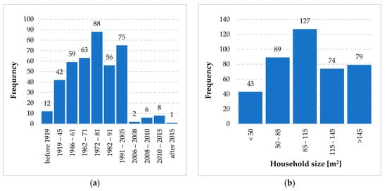 In this section the frequency analysis related to the building characteristics is presented. Specifically, Figure 2a shows the buildings subdivision according to the construction year, following the official classification used in the Italian population censuses []. From data it emerges that a large part of the sample buildings was built before 1976, the year in which the first Italian law on energy saving was issued. In addition, Figure 2b depicts the buildings frequency as a function of their size once five different dimensional classes have been identified (i.e., small < 50 m2; small-medium 50–85 m2; medium 85–115 m2; medium-large 115–145 m2; large > 145 m2). The apartments’ average size is equal to 112.4 m2 and the most common class is the middle one.