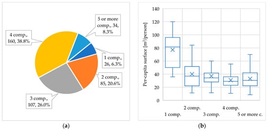 Figure 3a shows the apartments’ subdivision by the number of family members; the most recurrent classes consist of three people households and four people households, with shares equal to 26.0% and 38.8%, respectively. The per capita surface decreases as the number of family members increases (see Figure 3b), ranging from an average value of 77 m2/person for single-core households up to 31 m2/person for all those families consisting of four components.