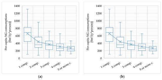 The average value of per capita NG consumption is equal to 368 Sm3/(y·person); as the family members increase (Figure 5), the NG per capita consumption lessens from 654 Sm3/(y·person) (one component) to 269 Sm3/(y·person) (five or more components). As regards the average value of per capita electricity consumption, it is equal to 772 kWh/(y·person); similarly, it decreases as the number of components increases, from 1184 kWh/(y·person) (one component) to 617 kWh/(y·person) (five or more components). Having said this, comparing Italy with other countries, it emerges that in the domestic sector, per capita electricity consumption is quite low. Indeed, the European average value is 1566 kWh/(y·person), while in the United States and Finland it exceeds 4000 kWh/(y·person) [,]. That demonstrates how the Italian residential sector is poorly electrified reflecting its dependence on fossil fuel -based technologies, especially for the heating purpose.