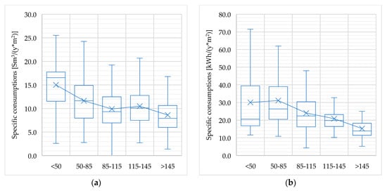 Finally, a parametric assessment of electricity and gas consumptions was carried out, normalising all data by the number of components and the building floor surface. In detail, the per capita consumptions have been correlated to the number of components while the specific consumptions by unit of surface have been plotted as a function of building size classes. Those KPIs have been built in accordance with the current Italian building energy certification system, providing technical information related to the building characteristics and the occupants’ behaviour. Anyway, by rearranging those values it is possible to calculate the most common environmental and economic KPIs as reported in literature [].