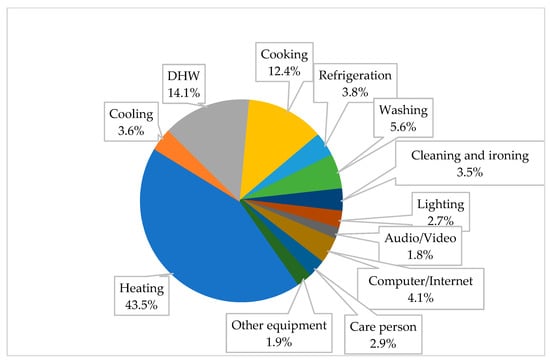 It is important to point out that part of residential consumption is electrical, and only a fraction of it can be considered flexible. A great potential for flexibility can be found in buildings equipped with electric heating systems; the impact on overall consumption depends on the climatic zone (i.e., outdoor temperature and relative humidity), on the buildings’ characteristics and on the occupancy rate []. Likewise, a great potential for flexibility can be noted in buildings equipped with domestic hot water preparation systems; in that case the impact on overall consumption essentially depends on the intended use and the number of occupants []. In addition to those consumptions, there are further deferrable loads owing to the use of washing machines, dishwashers or dryers, whose incidence is correlated to the users’ number [].