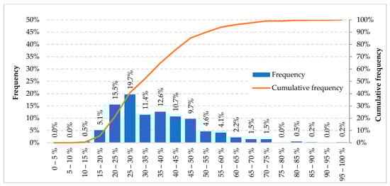 The collected data by the online questionnaires confirm the low electrification degree of Italian residential users (see Figure 9). Nevertheless, referring to the analysed statistical sample, the average electrification degree is equal to 36.5%, resulting therefore greater than the aforementioned value. Moreover, only 14.8% of those dwellings exceed that average value showing an electrification degree higher than 50%, while only one home gets the 100%.