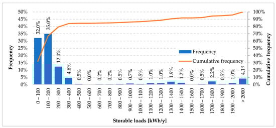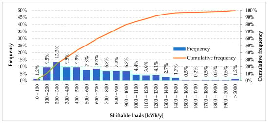 According to the electrical loads’ classification in Section 2, both storable and shiftable loads have been estimated. Figure 10 depicts the frequency analysis related to the storable loads associated to the statistical sample. On average, storable loads of 381 kWh/y can be identified; most homes (84.0%) are characterised by storable loads less than 400 kWh/y, while 67.0% shows storable loads lower than 200 kWh/y. It is important to highlight how the larger storable loads value can be found in all of those dwellings where the DHW is produced by electric water heater or where the equipment for summer air conditioning are mostly used.